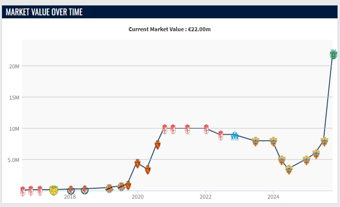 此前球員身價(jià)為800萬歐,如今身價(jià)暴漲了1400萬歐,漲至2200萬歐。