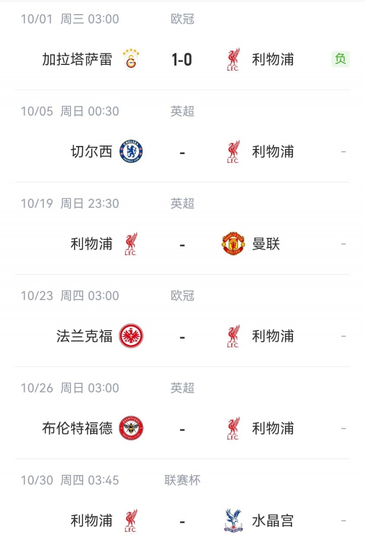 本周末,利物浦將在聯(lián)賽中對陣切爾西,后者聯(lián)賽遭遇兩連敗。之后進(jìn)入國際比賽日,10月下半月,利物浦又將連戰(zhàn)曼聯(lián)、法蘭克福、布倫特福德和水晶宮。