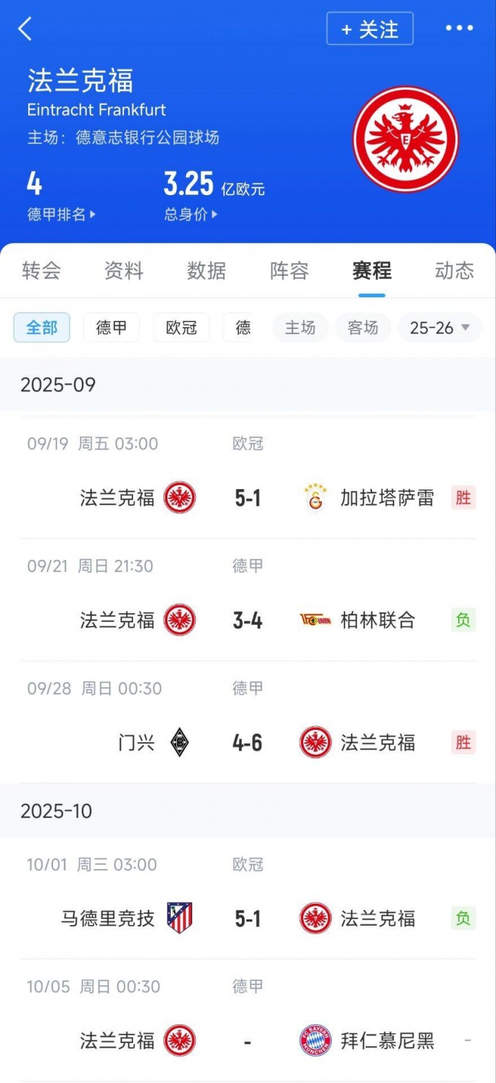 近4場(chǎng)比賽,法蘭克福的戰(zhàn)績(jī):5-1加拉塔薩雷,3-4柏林聯(lián)合,6-4門興,1-5馬競(jìng),每場(chǎng)比賽至少6球,不是你死就是我亡。下一場(chǎng)比賽,法蘭克福主場(chǎng)迎戰(zhàn)拜仁。